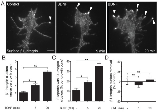 Figure 1. BDNF stimulates β1-integrin clustering in the nerve growth cone. (A) Xenopus spinal neuron growth cone immunolabeled for surface β1-integrin after treatment with vehicle alone (Control), or 5 min and 20 min BDNF (50 ng/mL) bath application. Arrowheads denote β1-integrin clusters. Scale bar, 5 μm. (B, C) Quantification of β1-integrin clustering after 5 min and 20 min BDNF treatment expressed as mean number of clusters per growth cone (B) and the percentage of growth cone filopodia that contain at least one β1-integrin cluster (C; see Methods). (D) Quantification of β1-integrin surface levels in the growth cone after 5 min and 20 min BDNF treatment (see Methods). Data are the mean ± standard error of the mean. (n > 200, n/s P > 0.05, *P < 0.01, **P < 0.001, ANOVA with Tukey's post hoc analysis.) BDNF: brain-derived neurotrophic factor.