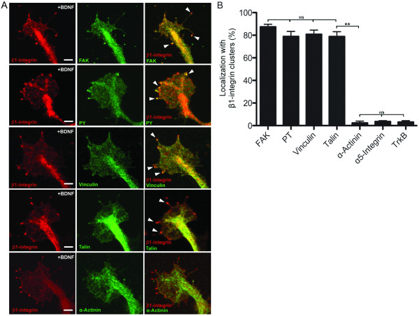 Figure 2. BDNF triggers the formation of nascent growth cone adhesions. (A) Representative confocal images of dual immunolabeled growth cones showing β1-integrin (red) and known cytoplasmic adhesion components (green: FAK; PY; vinculin; talin; α-actinin) after BDNF treatment (50 ng/mL; 20 min). Arrowheads in the merged images denote spots of co-localization. Scale bar, 5 μm. (B) Quantification of the percentage of total immunostaining for adhesion components, α5-integrin, and TrkB receptors that overlapped with β1-integrin clusters. Data are the mean ± standard error of the mean. (n > 40, n/s P > 0.05, **P < 0.001, ANOVA with Tukey's post hoc analysis.) BDNF: brain-derived neurotrophic factor; FAK: focal adhesion kinase; PY: phosphotyrosine.