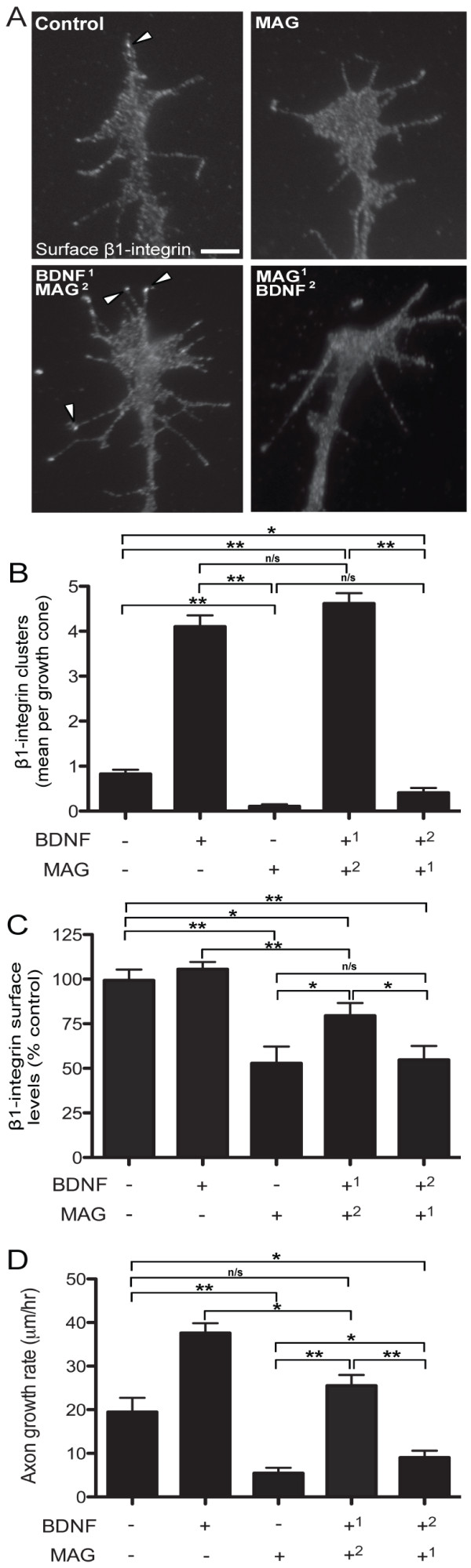 Figure 6. BDNF priming counteracts inhibitory MAG-effects on β1-integrin clustering and growth inhibition. (A) Representative immunolabeled images showing β1-integrin after control (BSA), MAG (1 μg/mL; 5 min), or combination treatments with BDNF (50 ng/mL; 20 min) and MAG. Detailed time course graphical representation of the combination treatments located in Additional file 8. Arrowheads designate clustered β1-integrins. Scale bar, 5 μm. (B) Quantification of β1-integrin clustering after vehicle (BSA), BDNF (50 ng/mL), and MAG (1 μg/mL) treatments alone or followed by secondary exposure to BDNF or MAG. (C) Quantification of β1-integrin surface levels after vehicle (BSA), BDNF (50 ng/mL), and MAG (1 μg/mL) treatments alone or followed by secondary exposure to BDNF or MAG. (D) Quantification of the mean axon growth rate according to the treatment groups. Data are the mean ± standard error of the mean. (n > 150, *P < 0.01, **P < 0.001, ANOVA with Tukey's post hoc analysis.) BDNF: brain-derived neurotrophic factor; BSA: bovine serum albumin; MAG: myelin-associated glycoprotein.