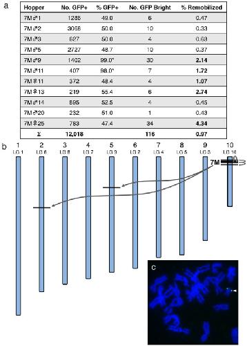 Figure 7. Transposon hopping from the 7M donor locus. (a) The outcross progeny from nine 7M hopper adults were scored for changes in GFP intensity indicative of transposon remobilization. The 7M donor locus contains a concatemer of approximately eight to ten pT2βGFP transposons on chromosome 10. The remobilization frequency is expressed as a percentage of GFP bright tadpoles observed in the GFP-positive outcross population. 7M hopper frogs 7M♂9 and 7M♂11 are 'functionally homozygous' for both the transposon substrate allele and the transposase enzyme transgene (see text for details), and display higher remobilization activity (approximately 1.8%) than their 'heterozygous' male hopper littermates (7M♂1, 7M♂2, 7M♂3, 7M♂5, 7M♂14, 7M♂20; approximately 0.44%). Outcross of 7M hopper 7M♀25 produced a remobilization rate of > 4%. (b) Schematic representation of the X. tropicalis chromosomes indicating the distribution of remobilized SB transposons. The parental 7M donor site (thick line) is located on scaffold 38 which maps to chromosome 10. Remobilization of discrete transposons away from the 7M donor locus is represented by the grey arrows. (Not to scale.) (c) Fluorescence in situ hybridization of metaphase chromosomes verifies that the 7M parental donor locus is located near a telomere of X. tropicalis chromosome 10. GFP: green fluorescence protein; SB: Sleeping Beauty.