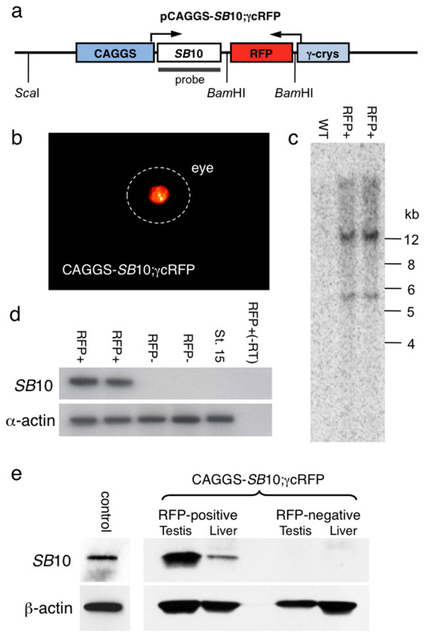 Figure 1. Generation of a transgenic Xenopus tropicalis that expresses SB10 transposase. (a) Schematic of the pCAGGS-SB10;γcRFP construct used to develop SB (SB10) transposase-expressing transgenic frogs. The two transgenes were cloned in a tail-to-tail orientation. Not to scale. (b) Red lens in the righteye of an adult F1 transgenic frog from outcross of founder CAGGS-SB10;γcRFP 2 M. The border of the eye is indicated by the dashed white line. (c) Southern blot analysis of genomic DNA harvested from RFP-positive and control animals indicated integration of multiple copies of the CAGGS-SB10;γcRFP linear transgene. The DNA was digested with BamHI and the blot was probed with a radiolabelled SB10 cDNA probe (see schematic (a)). (d) RT-PCR analysis of SB10 expression in tadpoles. SB RNA was detected in RFP-positive tadpoles (+RFP) but not in RFP-negative (-RFP) progeny from CAGGS-SB10;γcRFP 2M. RNA from a wild-type tadpole was used as a negative control (St. 15). A mock reverse transcription reaction, without added RT, with RNA harvested from an RFP-positive tadpole (+RFP(-RT)) was used as a negative control. Primers for X. tropicalis α-actin were used as a control for RNA recovery. (e) Western blot analysis of SB transposase expression in tissues harvested from adult transgenic frogs. A monoclonal antibody to SB was used to demonstrate abundant transposase expression in the testis and liver of RFP-positive adults, but not in the RFP-negative siblings. Protein lysates prepared from tadpoles injected with SB10 mRNA at the one-cell stage were prepared at stage 15 (control lane). The blots were stripped and re-probed with a monoclonal antibody that recognizes Xenopus α-actin. PCR: polymerase chain reaction; RFP: red fluorescent protein; RT: reverse transcriptase; SB: Sleeping Beauty.