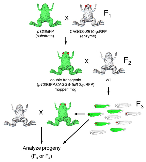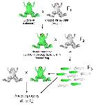Figure 2. Breeding strategy to generate double-transgenic hopper frogs. The F2 hopper frogs were outcrossed with wild-type animals and the progeny was scored for GFP and RFP expression. The GFP-positive/RFP-negative F3 progeny were either raised to adulthood for outcross or genomic DNA was harvested after stage 45 for molecular analyses. GFP: green fluorescent protein; RFP: red fluorescent protein.