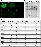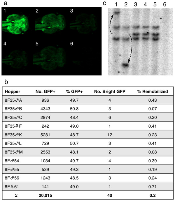 Figure 4. Excision and re-integration of SB transposons in the progeny of double-transgenic hopper frogs. (a) GFP expression in sibling tadpoles derived from the outcross of an 8F hopper frog. Tadpoles 1 and 2 are significantly brighter than their GFP-positive siblings (tadpoles 3, 4 and 5). Tadpole 6 is a GFP-negative tadpole. Dorsal view, with anterior facing towards the right. (b) Representative data for the outcross population of 8F hopper frogs. Table includes data from breeding four F2 (8Fâ54, 8Fâ55, 8Fâ56 and 8Fâ61) and seven F3 (8F35âA, B, C etc.) double-transgenic hoppers with wild-type frogs. The outcross progeny were scored for GFP expression and the GFP-bright progeny were either harvested for integration site analysis or raised to adulthood and outcrossed. A range of apparent remobilization activity from 0% to 0.7% was observed in individual 8F hopper frogs, with an average rate of two remobilization events per thousand GFP-positive progeny (0.2%). (c) Southern blot analysis of genomic DNA harvested from the progeny of double transgenic 8F hopper frogs. Genomic DNA was digested with BglII and the blot was probed with a radiolabelled GFP cDNA probe. DNA harvested from tadpoles in lanes 3, 4 and 5 have the same banding pattern as the parental pT2βGFP 8F founder line. Lanes 1 and 2 show example of remobilization of an SB transposon. The dashed arrow indicates the change in the mobility of the transposon-harboring BglII fragment. Lane 6 contains DNA from GFP-negative siblings. GFP: green fluorescent protein; SB: Sleeping Beauty.