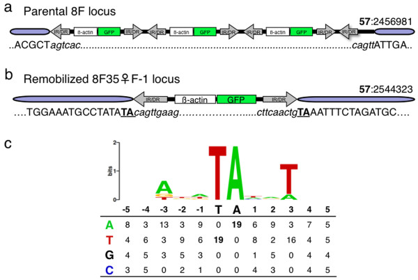 Figure 5. Integration site analysis of remobilized SB transposons. (a) Schematic representation of the 8F donor locus showing the predicted orientation of the trimeric concatemer in scaffold 57. This injection-mediated integration event occurred by a non-canonical mechanism. (Not to scale.) (b) Schematic representation of the novel integration event in the remobilized tadpole shown in Figure 4b. EPTS LM-PCR was used to clone the sequence flanking the 5' end of the pT2βGFP transposon and the 5' and 3' flanking sequences were verified using PCR primers designed to the scaffold sequence. The novel integration event occurred on the same scaffold (57 at position 2544323 bp) of the Joint Genome Institute X. tropicalis genome sequence assembly v4.1 as the 8F transposon donor locus (57:2456981) and represented a local hop. The sequence of the SB transposon and genomic DNA junctions (arrows) indicated that the remobilization event occurred via a canonical transposition reaction. The pT2βGFP transposon is flanked by the expected TA dinucleotide target site duplication (TSD; bold underlined), and the transposon is inserted precisely, without any flanking plasmid sequence from the donor site. The genomic DNA sequence of scaffold 57 is capitalized and the transposon sequence is in lowercase italics. (Not to scale.) (c) The preferred sequence for SB transposon re-integration in the X. tropicalis genome. Weblogo analysis http://weblogo.berkeley.edu for the five base pair sequence flanking the TA target site. The relative size of the letters indicates the strength of the information on the y-axis, with the maximum indicated by two bits. The table shows the base distribution of the pT2βGFP transposon re-integration target sites. EPTS LM-PCR: extension primer tag selection linker-mediated polymerase chain reaction; PCR: polymerase chain reaction; SB: Sleeping Beauty.