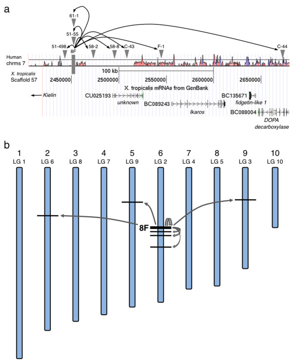 Figure 6. Schematic representation of remobilized SB transposons in the X. tropicalis genome. (a) Local hopping on X. tropicalis chromosome 6 depicts the integration sites for eight local (< 200 kb) remobilization events (hops). (Not to scale.) This region of X. tropicalis chromosome 6 is syntenic with human chromosome 7. The Vista http://genome.lbl.gov/vista alignment shows regions of homology between the frog and human genomic sequences; pink represents non-coding regions and blue represents conserved exons. The position of the 8F donor concatemer is indicated by the grey box. The remobilized transposition events are depicted by the grey triangles. The position and orientation of predicted genes near the 8F locus are depicted in the lower section of the panel. (b) Schematic representation of the X. tropicalis chromosomes indicating the distribution of remobilized SB transposons. The parental 8F donor site is on chromosome 6 (thick line). The predicted loci of the remobilized transposons are depicted by the thin black lines. Approximately 80% of the remobilization events occur near the donor locus (local hopping), and the remaining 20% are distributed randomly throughout the genome. SB: Sleeping Beauty.