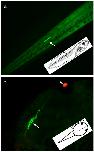 Figure 3. Somatic remobilization of pT2βGFP in double transgenic tadpoles. Outcross of double transgenic hopper frogs resulted in progeny that inherited both transgenes. In rare instances, we identified double transgenic tadpoles that express intense levels of the GFP transgene reporter in individual cells or in small groups of cells. The change in GFP expression seen in these somatic cells is likely to be due to sporadic remobilization of the pT2βGFP transposon and the change in GFP intensity is likely due to the influence of the local chromatin environment at the novel integration site. The region of each tadpole shown (dashed box) is indicated on the cartoon inset. (a) Tail of a double transgenic tadpole with a single muscle cell expression intense GFP (arrow). (b) Double transgenic tadpole with high-level GFP expression in a subset of cells in the brachial cartilage (arrow). The immobilized tadpole was also photographed using a dsRED filter and the two images were overlaid to demonstrate that this animal had inherited the CAGGS-SB10;γcRFP transgene (RFP expression in the lens is indicated by the white arrowhead). GFP: green fluorescent protein; RFP: red fluorescent protein.