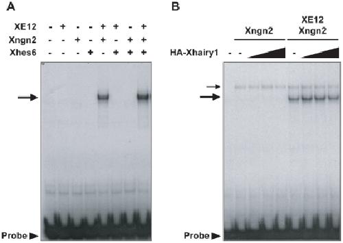 Figure 4. Effects of Hes6 and Xhairy1 proteins on Xngn2/E12 DNA-binding activity.A DNA fragment containing E-box element from the mouse NeuroD promoter was labeled with 32P and incubated with the in vitro translated proteins shown. The reaction mixture was then analyzed on a native polyacrylamide gel. (A) Effect of Xhes6 on DNA-binding activity of Xngn2/E12. Arrow indicates complex of Xngn2/E12 and DNA. Free probes are shown by arrowhead. (B) Effect of Xhairy1 on DNA-binding activity of Xngn2/E12. Faint bands with slow mobility (thin arrow) are non-specific protein and DNA complexes. Thick arrow indicates Xngn2/XE12 probe complex. Neither Xhes6 and Xhairy1 affect heterodimer formation or the DNA binding activity of Xngn2/XE12 proteins.