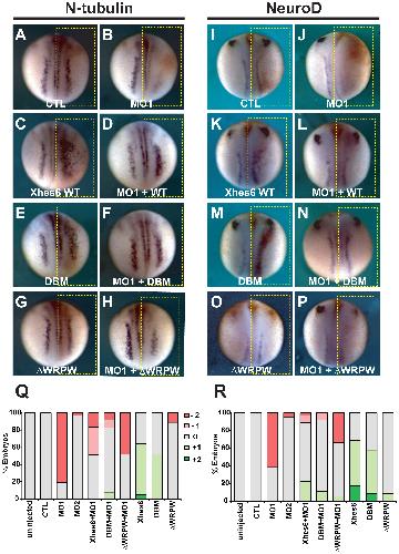 Whole mount in situ hybridization of neurula stage embryos for neural markers neural β-tubulin (N-tubulin, A-H) or NeuroD (I-P). A, B, I, J: One cell of two cell stage embryos was injected with control (CTL, A, I) or Xhes6 (MO1, B, J) morpholinos along with β-gal tracer mRNA (red staining). Injection of MO1 decreases both N-tubulin and NeuroD expression on the injected side (yellow box). C-H, K-P: Rescue of MO1 phenotype. 500 pg of mRNA encoding wild type Xhes6 or DNA binding domain (DBM) or Groucho binding domain, (ΔWRPW) mutants was injected with or without MO1. Overexpression of Xhes6 (C, K) or DBM (E,M) alone enhances neural differentiation, both Xhes6 and DBM rescue neural maker expression in Xhes6 morphants (D, F, L, N). The ΔWRPW mutant has minimal effect when injected alone (G, O) and is less efficient in rescuing the MO1 phenotype. Q,R quantitation of phenotypes observed, scored as in Fig. S2, Q, N-tubulin mRNA expression, corresponding to panels A-H, R, NeuroD mRNA expression, corresponding to panels I-P. Full data on the frequency of phenotypes and the number of embryos analyzed is given in Table 1.