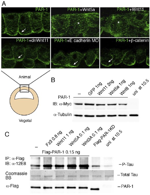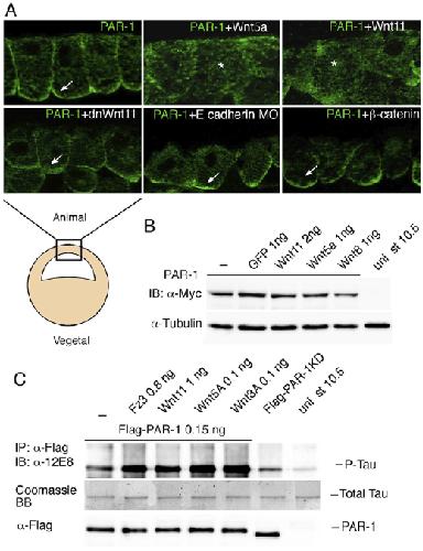 Fig. 5. Wnt5 and Wnt 11 influence PAR-1 localization and activity. (A)Wnt5a or Wnt11 RNAs (1 ng each) trigger the relocalization of Myc- PAR-1 (co-injected as 0.3 ng of RNA) from the basolateral cortex to the cytoplasm in embryonic ectoderm (arrow, anti-Myc staining). The asterisk indicates cytoplasmic staining. By contrast, PAR-1 distribution is not significantly affected by dnWnt11, E-cadherin depletion or b- catenin overexpression (lower panels). The location of the superficial ectoderm cells used for this analysis is illustrated beneath. (B)Western analysis reveals comparable Myc-PAR-1 levels in the presence of Wnt or control GFP RNAs in stage 10.5-11 embryonic lysates. alpha-tubulin is a loading control. (C)Wnt signaling increases Flag-PAR-1 protein kinase activity as assessed by hTau phosphorylation at Ser262/356 detected by a phospho-specific antibody. Recombinant hTau protein was added at 1ug per sample. Amounts of precipitated PAR-1 were assessed by anti-Flag antibody. |