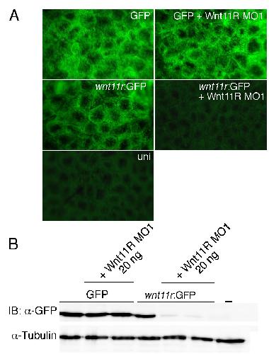 Fig. S3. Efficiency of Wnt11R depletion. (A) The efficiency of Wnt11R depletion was assayed in vivo by co-injecting 500 pg wnt11r:GFP RNA containing MO target sequence or control GFP RNA with 20 ng Wnt11R MO1. Wnt11R MO1 does not significantly affect control GFP RNA translation (top panels). By contrast, wnt11r:GFP RNA-injected sample fluorescence is strongly reduced by Wnt11R MO1 (middle panels). An uninjected embryo is shown at the bottom as a negative control. (B) Western analysis of GFP levels from embryos shown in A; α-tubulin is a loading control. Wnt11R MO1 efficiently blocks protein translation from wnt11r:GFP RNA but not from control GFP RNA. |