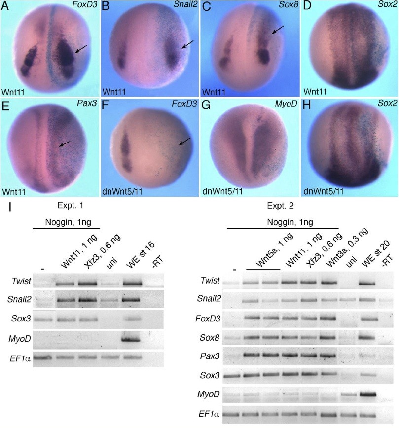 Fig. 1. Modulation of neural crest markers by noncanonical Wnt signaling. (A-H)Albino Xenopus embryos were injected animally with 0.5-1 ng Wnt11 (A-E) or dnWnt5/11 (F-H) mRNA at the four-cell stage, cultured until stage 14/16 and the expression of FoxD3 (A,F), Snail2 (B), Sox8 (C), Sox2 (D,H), Pax3 (E) and MyoD (G) analyzed by in situ hybridization. b-galactosidase is a lineage tracer (light blue) marking the injected side. Arrows point to altered marker expression. Dorso-anterior view is shown. (I) RT-PCR analysis of gene expression in neuralized animal caps. Animal caps were isolated from embryos at stage 9, injected with RNA as indicated, and cultured until stage 16/20 for RT-PCR analysis. Snail2, Twist, FoxD3, Sox8 and Pax3 are induced by Wnt signaling in the absence of significant changes in the pan-neural marker Sox3. no Wnt or Frizzled stimulation; uni, uninjected animal caps; WE, whole embryos; T, no reverse transcriptase. |