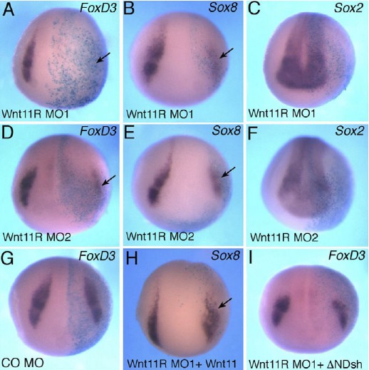 Fig. 4. Wnt11R is essential for neural crest specification. (A-F)Xenopus embryos were injected with the indicated MOs or RNAs and processed for in situ hybridization as described in Fig. 1. Wnt11R MO1 (A-C) and MO2 (D-F) inhibit FoxD3 (A,D) and Sox8 (B,E) but do not significantly affect Sox2 (C,F). (G)Control MO (CO MO) does not alter FoxD3. (H,I)Wnt11 and delta-N-Dsh RNAs partially suppress the inhibitory effect of Wnt11R MO1 on Sox8 (H) and FoxD3 (I). |