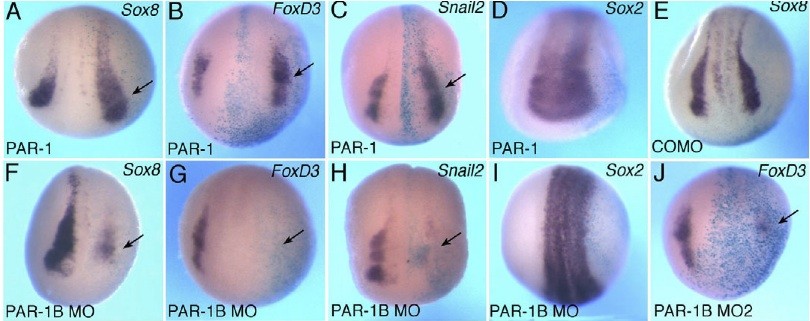 Fig. 6. PAR-1 plays an essential role in neural crest specification. Xenopus embryos were injected with RNAs or MO and in situ hybridization analysis was carried out as described in Fig. 1. (A-D)PAR-1 RNA (0.3 ng) upregulates Sox8 (A), FoxD3 (B) and Snail2 (C) but does not affect Sox2 (D). (E-I)Effects of PAR-1 depletion. (E)ï Control MO (COMO) does not change Sox8. (J)PAR-1B MO2, which has a different sequence, has a similar effect to PAR-1B MO (G). Arrows indicate a change in marker gene expression. Dorso-anterior view is shown. |