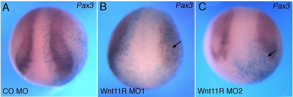 Fig. S4. Wnt11R depletion reduces the Pax3 domain. Embryos were injected and processed as described in Fig. 1. (A) Pax3 is not changed by control MO (CO MO) injection (20 ng). (B,C) Wnt11R MO1 (20 ng; B) or Wnt11R MO2 (40 ng; C) partially suppresses Pax3 in stage 14/15 embryos. Arrows indicate changes in marker expression. Dorso-anterior view is shown. |