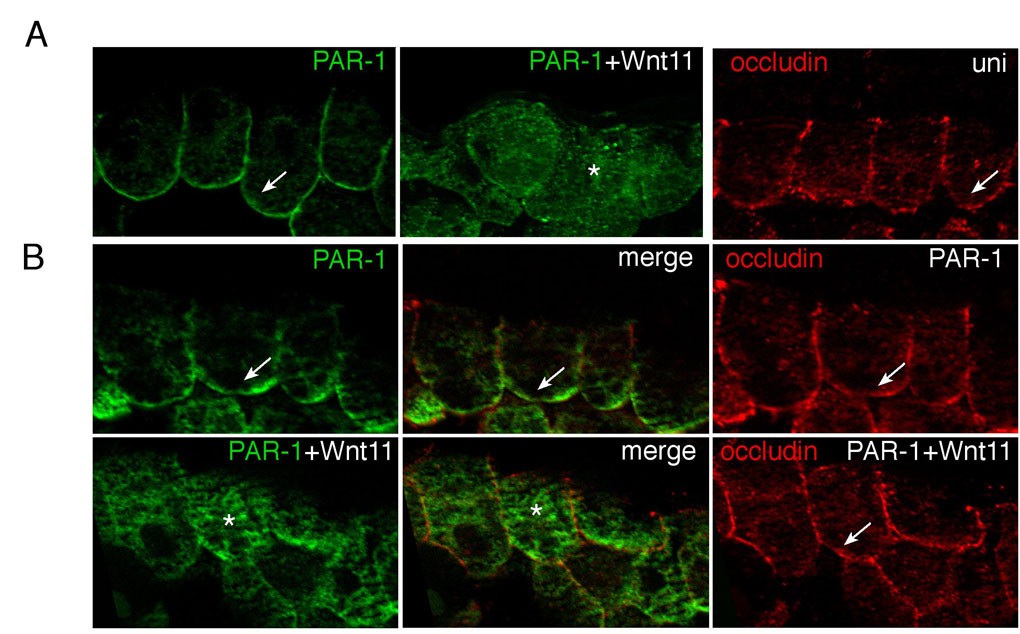 Fig. S5. Redistribution of PAR-1 in response to Wnt11. (A) The basolateral localization of GFP-PAR-1 is disrupted by Wnt11 in ectodermal cells. Methods are as in Fig. 3B, except that GFP-PAR-1 was used instead of Myc-PAR-1. (B) Wnt11 causes the redistribution of Myc-PAR-1 from the basolateral cortex to the cytoplasm, but does not alter the basolateral distribution of occludin. Arrows indicate basolateral Myc-PAR-1 or occludin. Asterisk indicates cytoplasmic Myc-PAR-1 in the presence of Wnt11. |