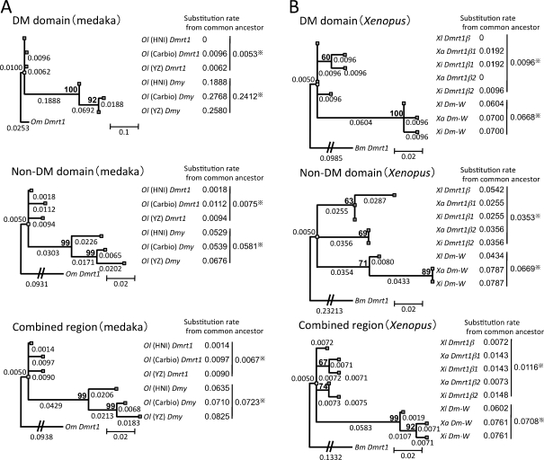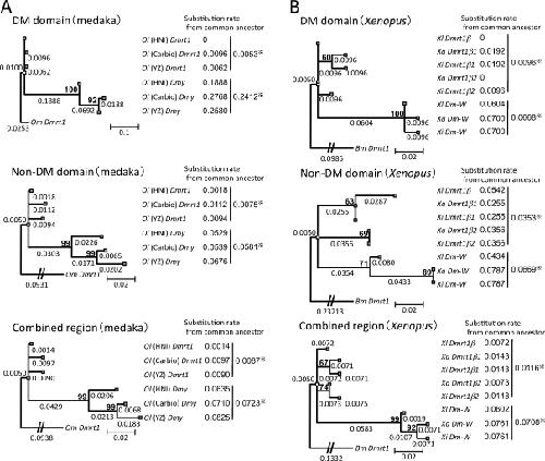 Fig. 3. Comparisons of substitution rates among Dmy, Dm-W, and their prototype gene Dmrt1. The phylogenetic trees were constructed from three groups of medaka and O. marmoratus (Om) as an outgroup (a) or three species of Xenopus and Bufo marinus (Bm) as an outgroup (b), using the maximum likelihood method based on the Tamura 3-parameter model with 4 discrete gamma distribution categories (a) or Kimura 2-parameter model (b). The three trees of each panel were derived from the DM domain region (upper), the non-DM domain region (middle), and their combined region (lower). The number shows the branch length, which was defined as the number of nucleotide substitutions per site for the branch. The substitution rates of Dmy or Dm-W and their prototype gene Dmrt1 (right side of each panel) were calculated using the branch lengths from the position of their common ancestor (white block) to the branch tip corresponding to each gene (gray block). Bootstrap percentage values of 500 replications are shown in bold above the node. Dmy and Dm-W diverged from the their prototype genes 10 and 13â64 million years ago, respectively (Kondo et al. 2004; Bewick et al. 2011). *An average of the substitution rates of sex-determining genes or thier prototype gene. Ol, O. latipes; Xl, X. laevis; Xa, X. andrei; Xi, X. itombwensis