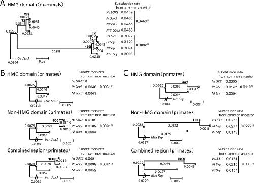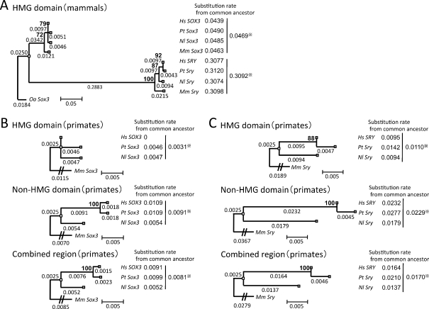 Fig. 4. Comparisons of substitution rates among a sex-determining gene Sry and its prototype gene Sox3. The phylogenetic trees were constructed from the HMG domain regions of Sox3 and Sry (a) in four species of primates and Ornithorhynchus anatinus (Oa) as an outgroup, Sox3 (b) or Sry (c) in three species of primates and Macaca mulatta (Mm) as an outgroup, using the maximum likelihood method based on the Kimura 2-parameter model (a), Hasegawa-Kishino-Yano model (b), or the Kimura 2-parameter model (c). The three trees in (b) and (c) were derived from the HMG domain region (upper), the non-HMG domain region (middle), and their combined region (lower). Calculations of the substitution rates were performed as described in Fig. 3. Sry diverged from the prototype genes 148–166 million years ago (Marques-Bonet et al. 2009). A common ancestor of Homo. sapiens, Pan. troglodytes, and Nomascus leucogenys diverged from M. mulatta 18 million years ago (Marques-Bonet et al. 2009). Hs, H. sapiens; Pt, Pan troglodytes; Nl, Nomascus leucogenys
