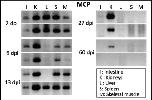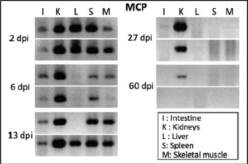 Figure 1. Slow clearance of FV3 DNA in X. tropicalis. FV3 DNA detected by PCR (35 cycles) using primers specific for the major capsid protein (MCP) on genomic DNA purified from various tissues of outbred X. tropicalis adults that were infected with FV3 by i.p. injection of 1 × 106 PFU for 2, 6, 13, 27 and 60 days (2 individuals per time point).
