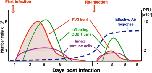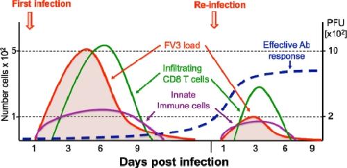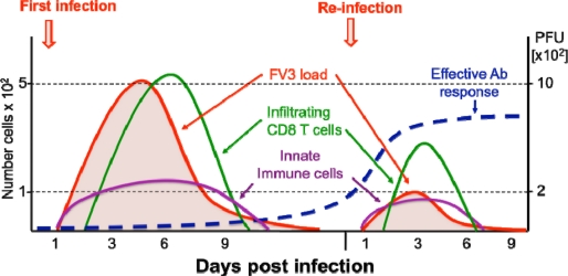 Figure 2. Schematic view of Xenopus adult immune response kinetics in infected kidneys. During both primary and secondary FV3 infections, MHC class II+ innate immune cell effectors (leukocytes) rapidly accumulate in the kidneys (violet line), the main site of infection, and pro-inflammatory genes (e.g., TNF-α, IL-1β) are induced. This is followed by an adaptive CD8 T cell response and infiltration (green line) that peak at 6 dpi during a primary infection. During a second FV3 infection, CD8T cell response and infiltration peak 3 days earlier, which suggests T cell memory. However, the lower number of infiltrated CD8 T cells (5 time less) suggests that anti-FV3 antibodies (blue line) and B cell memory are playing a prominent role during secondary infection resulting in a faster viral clearance (red line).