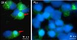 Figure 4. Immunofluorescence microscopy of baby hamster kidney cells (BHK, left) and Xenopus PLs infected in vitro for 2 days with FV3 (0.3 MOI). Cells were cytocentrifuged on microscope slides, fixed with formaldehyde, permeabilized with ethanol, incubated with a rabbit anti-53R and FITC-conjugated donkey anti-rabbit Abs (Green); then stained with the DNA dye Hoechst-33258 (Blue) mounted in anti-fade medium and visualized with a Leica DMIRB inverted fluorescence microscope. Note the large viral assembly sites in BHK cells that contain large amount of viral DNA stained Hoechst-33258 and anti-53R Ab (arrows). In contrast, anti-53R staining is weaker in PLs, and no assembly sites are detected.
