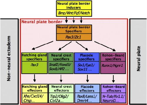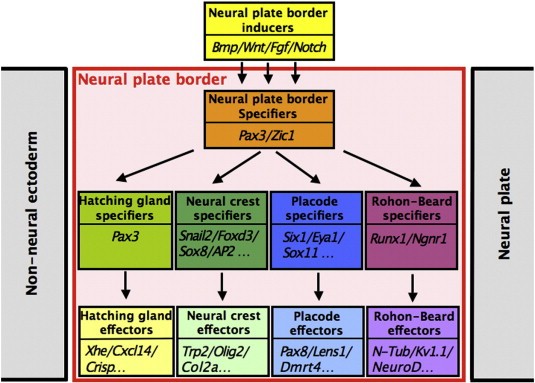 Fig. 8. Model of the gene regulatory network regulating cell fate at the neural plate border. This model is an extension of the model proposed by [Meulemans and Bronner-Fraser, 2004] and [Litsiou et al., 2005] for NC and PE specification. Based on our current observations and other studies (Hong and Saint-Jeannet, 2007) this regulatory cascade has been expanded to include two additional NPB cell types, RB neurons and HG cells.