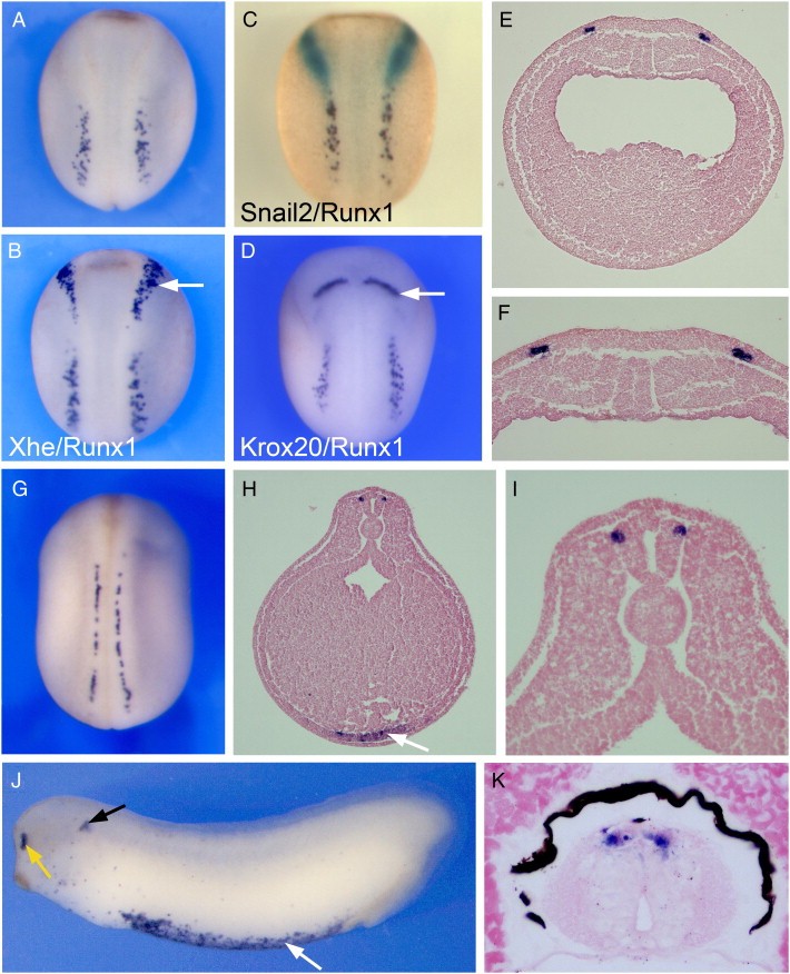 Fig. 1. Expression of Runx1/Xaml1 in Rohon-Beard sensory neurons by whole-mount in situ hybridization. (AâF) Runx1 expression in stage 15 embryos. (A) Runx1 is detected at the posterior portion of the NPB. (B) Double in situ hybridization for Runx1 and the HG marker Xhe. Runx1 positive cells are located posterior to HG cells (arrow). (C) Double in situ hybridization for Runx1 and the neural crest marker Snail2. Runx1 expression (purple) is distinct from and posterior to the neural crest forming region (Snail2, green staining). (D) Double in situ hybridization for Runx1 and the hindbrain marker Krox20 (arrow). Panels (AâD), dorsal view, anterior to top. (E) Transverse section, dorsal to top, showing that Runx1 is restricted to two discrete domains at the neural plate border. (F) Higher magnification of the neural plate region of the embryo shown in (E). (G) At stage 22 as the neural tube closes, Runx1 expression is restricted to the dorsal aspect of the spinal cord. Dorsal view, anterior to top. (HâI) Transverse section through a stage 23 embryo, dorsal to top. Runx1 is confined to the dorso-lateral region of the spinal cord. Runx1 is also detected ventrally in the lateral plate mesoderm, precursor of the hematopoietic lineage (arrow). (I) Higher magnification of the neural tube region of the embryo shown in (H). (J) Runx1 expression in a stage 28 embryo. Runx1 is detected in the olfactory epithelium (yellow arrow), periotic mesenchyme (black arrow), and blood precursors (white arrow). Lateral view, anterior to left. (K) Transverse section through the spinal cord of a stage 45 embryo shows Runx1 expression in RB sensory neurons in the dorsal spinal cord. Dorsal to top.