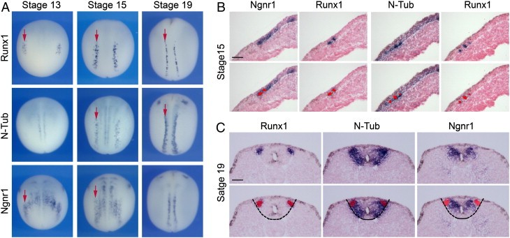 Fig. 2. Comparative expression of Runx1, N-Tub and Ngnr1 in primary neurons. (A) Developmental expression of Runx1, N-Tub, and Ngnr1 at the neural plate border in stage-matched embryos. The arrows indicate the position of the row of RB sensory neurons. Dorsal views, anterior to top. (BâC) In situ hybridization on adjacent transverse sections of stage 15 and stage 19 embryos, dorsal to top. (B) At stage 15 Runx1 is co-expressed with N-Tub and Ngnr1, as indicated by the red overlay in the lower panels. (C) At stage 19 while Runx1 and N-Tub are still co-expressed, Ngnr1 expression is lost in the RB neurons population, as indicated by the red overlay in the lower panels. The dotted lines demarcate the position of the spinal cord.