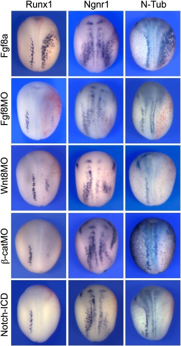 Fig. 3. Wnt, Fgf and Notch signaling pathways regulate Runx1. Overexpression of Fgf8a by injection of Fgf8a mRNA in one blastomere at the 2-cell stage results in an expansion of the Runx1 expression domain. The expression domain of N-Tub and Ngnr1 is also expanded in these embryos. Knockdown of Fgf8a (Fgf8aMO) causes a severe reduction of all three genes. Similarly, interference with canonical Wnt signaling, by injection of Wnt8MO or β-catMO, reduces Runx1, N-Tub and Ngnr1 expression in all three populations of primary neurons. Expression of an activated form of Notch (Notch-ICD) also represses Runx1 expression. In all panels embryos are viewed from the dorsal side, anterior to top. The injected side is on the right.