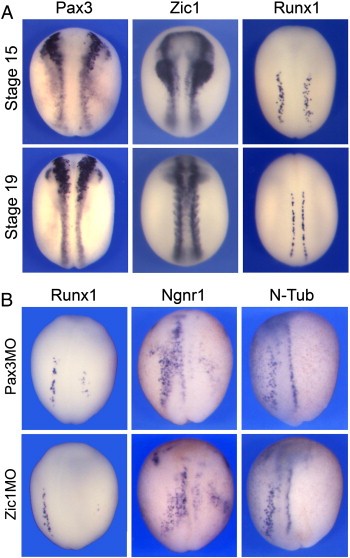 Fig. 4. Runx1 expression in RB sensory neurons depends on Pax3 and Zic1. (A) Comparative expression of Pax3, Zic1 and Runx1 in stage-matched embryos indicates that the Runx1 expression domain overlaps with that of these two NPB specifiers. (B) Embryos injected with Pax3MO (50 ng) or Zic1MO (45 ng) in one blastomere at the 2-cell stage exhibit a strong reduction of Runx1 as well as N-Tub and Ngnr1 expression in RB progenitors. The injected side is on the right. In all panels embryos are viewed from the dorsal side, anterior to top.