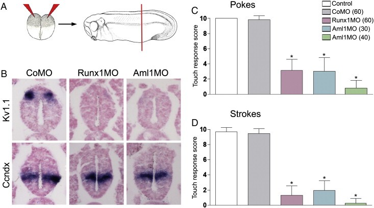 Fig. 5. Runx1-deficient tadpoles lack Rohon-Beard sensory neurons and lose response to touch. (A) Two-cell stage embryos received a bilateral injection of control (CoMO), Runx1 (Runx1MO) or Aml1 (Aml1MO) morpholino antisense oligonucleotides. At stage 28 the corresponding embryos were sectioned in the trunk region (red line) and analyzed by in situ hybridization. (B) Expression of Rohon-Beard (Kv1.1) and motor neuron (Ccndx) marker genes in the spinal cord of morphant embryos. Runx1MO and Aml1MO show a loss of Kv1.1 expression, while the ventral motor neurons are largely unaffected. (CâD) At stage 32 Runx1MO and Aml1MO injected embryos have a severely reduced response to touch (pokes and strokes) as compared to control uninjected or control morpholino (CoMO) injected embryos. (C) Pokes: Control (uninjected), 10.00 ± 0.00 (n = 30); CoMO (60 ng), 9.83 ± 0.53 (n = 30); Runx1MO (60 ng), 3.14 ± 1.45 (n = 28); Aml1MO (30 ng), 3.03 ± 1.82 (n = 20); Aml1MO (40 ng), 1.00 ± 1.19 (n = 15). (D) Strokes: Control (uninjected), 9.68 ± 0.56 (n = 30); CoMO (60 ng), 9.47 ± 0.63 (n = 30); Runx1 MO (60 ng), 1.30 ± 1.26 (n = 28); Aml1MO (30 ng), 1.95 ± 1.28 (n = 20); Aml1MO (40 ng), 0.33 ± 0.75 (n = 15). Statistical significance was determined using one-way ANOVA. The values are presented as mean SEM; * = P < 0.0001, versus Control and CoMO).