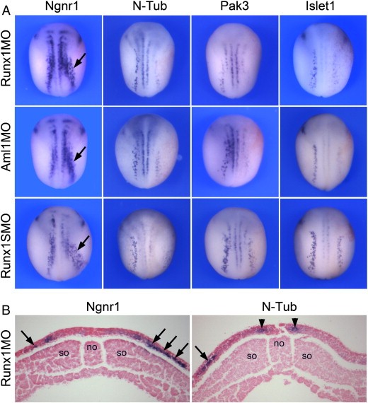 Fig. 6. Runx1-deficient embryos downregulate N-Tub, Pak3 and Islet1. (A) Embryos were injected in one blastomere at the 2-cell stage with Runx1MO, Aml1MO or Runx1SMO and analyzed at stage 15 for the expression of Ngnr1, N-Tub, Pax3 and Islet1. The RB expression domain of N-Tub, Pak3 and Islet1 is reduced while Ngnr1 expression is expanded (arrows). In all panels the injected side is on the right. Dorsal view anterior to top. (B) Transverse sections of representative Runx1MO-injected embryos. The expression of N-Tub is lost in RB progenitors while N-Tub expression in primary motor neurons precursors is unaffected (arrow heads). Ngnr1 expression is expanded (arrows). The injected side is on the right. Dorsal to top. no, notochord; so, somites.