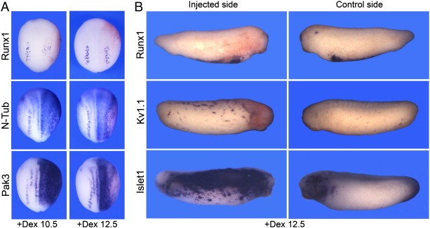 Fig. 7. Ngnr1 expression is not sufficient to activate Runx1 expression. (A) Embryos at the 2-cell stage were injected in one blastomere with 0.5 ng of Ngnr1-GR mRNA. Embryos were subsequently incubated with dexamethasone at early (+ Dex 10.5) or late (+ Dex 12.5) gastrula stages, and fixed at stage 15 for detection of Runx1, N-Tub or Pak3 by whole mount in situ hybridization. N-Tub and Pak3 are dramatically upregulated while the Runx1 expression domain is only marginally affected. The injected side is on the right. Dorsal view anterior to top. (B) At the tailbud stage (stage 27) these embryos show ectopic Kv1.1 and Islet1 expression in the ectoderm, independently of any upregulation of Runx1. Lateral views dorsal to top. Control and injected sides of the same embryo are shown for comparison.