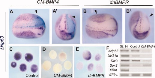 Figure 2. Np63 expression is decreased by inhibiting bone morphogenetic protein (BMP) signaling. A,Aâ²,B,Bâ²: One dorsal blastomere of 8- to 16-cell stage embryos was injected with 500 pg of CM-BMP4 (A,Aâ²) or dnBMPR mRNA (B,Bâ²) and the expression of Np63 was analyzed at stage 16. A,B: Dorsal view, anterior on the right. Aâ²,Bâ²: Anterior view, dorsal at the top. The injected side was recognized by FLDx staining (A,Aâ²) or fluorescence (B,Bâ²) and is indicated by an arrowhead. CâF: One-cell stage embryos were injected with CM-BMP4 (D,F) or dnBMPR mRNA (E). Control embryos were not injected. At stage 9, animal caps were dissected and processed for reverse transcriptase-polymerase chain reaction (RT-PCR) or in situ hybridization when sibling embryos reached neurula stage 16. CâE: Note the reduced Np63 expression analyzed by in situ hybridization in injected animal caps (D,E) compared with control caps (C). F: Total RNA was isolated from stage 14 embryos and treated and control caps and the expression of Np63, epidermal markers XK81a and Dlx3, neural marker Sox2 and the mesodermal marker XBra was analyzed by RT-PCR. EF1α amplification was used as control.Download figure to PowerPoint
