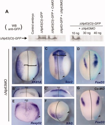 Figure 4. delta-Np63 is required for epidermal initial development. A: Both blastomeres of two-cell stage embryos were injected with delta-Np63(Ct)-GFP mRNA (3.5 ng/embryo). δNp63(Ct)-GFP was coinjected with CoMO (40 ng/embryo) or with δNp63MO (10, 30 or 40 ng/embryo). Injected and control embryos were cultured until stage 16 and processed for total protein extraction. delta-Np63(Ct)-GFP protein was detected by western blotting using an anti-green fluorescent protein (GFP) antibody. Each lane was loaded with 100 μg of total protein. delta-Np63MO inhibits translation of δNp63 in a dose dependent manner. BâG: delta-Np63MO (40 ng/embryo; BâF) or CoMO (40 ng/embryo; G) was injected into one blastomere of 8- to 16-cells stage embryos. Embryos were fixed at stage 16, and the expression of different genes was analyzed by in situ hybridization. BâD,G: Dorsal view, anterior at the top. F: Anterior view, dorsal at the top. Bâ²,Câ²,E: Transverse sections. Arrowhead indicates the injected side evidenced by the linage tracer FLDx. Dashed lines indicate the midline. Brackets indicate the width of the neural plate. B,E,F: δNp63-depleted embryos fail to correctly express epidermal markers XK81a (B), Rexp52 (E), and cement gland marker XAG (F). C,D: Neural plate marker Sox2 and neural crest marker FoxD3 are expanded in the delta-Np63MO-injected side of embryos. F: Injection of control morpholino (CoMO) showed no effect on FoxD3 expression. np, neural plate.Download figure to PowerPoint