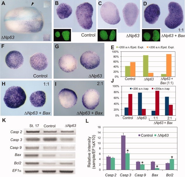 Figure 7. δNp63 inhibits apoptosis in embryos and animal caps. AâI: One dorsal blastomere of 8-cell stage embryos (A) or one-cell stage embryos (BâI) were injected with 1 ng of δNp63 (A,C,G), 1 ng of δNp63 + 1 ng of Bax (C,H), or 1 ng of δNp63 + 500 pg of Bax (I). A: Embryos were fixed at stage 16 or cultured. BâD: A set of embryos was grown until stage 13 and epidermis explants were dissected and cultured until the equivalent of stage 16. FâI: Another set was cultured until the blastula stage when animal caps were dissected and cultured until the equivalent of stage 16. Apoptosis was analyzed by terminal deoxynucleotidyl transferaseâmediated deoxyuridinetriphosphate nick end-labeling (TUNEL) staining. A: Dorsal view, anterior on the right. The arrowhead indicates the injected side containing FLDx as lineage tracer. B,C: Inset: FLDx evidenced by fluorescence. E: Quantification of the epidermis explants experiments. J: Quantification of the animal cap experiments. a.n., apoptotic nuclei. K: One-cell stage embryos were injected with 1ng of δNp63 mRNA; control embryos were not injected. Embryos were cultured until the blastula stage when animal caps were dissected out and processed for reverse transcriptase-polymerase chain reaction (RT-PCR). Caspases 2, 3, 9, Bax and Bcl2 expression was analyzed. EF1α was used as a loading control. L: Quantification of the gel that is shown in (K). Results are expressed as Relative Intensity (Sample/EF1αX10). Student's t-test was used to analyze the differences between each group and the corresponding control group. Differences were considered statistically significant at P < 0.001(*).Download figure to PowerPoint