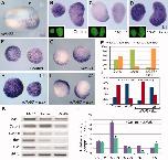 Figure 5. delta-Np63(Ct)-GFP acts as a dominant negative of delta-Np63. AâF: One dorsal blastomere of eight-cell stage embryos was injected with 0.5 ng (F), 2.0 ng (F), or 3.5 ng (AâC,F) of delta-Np63(Ct)-GFP mRNA or with different combinations of delta-Np63(Ct)-GFP and delta-Np63 (DâF). Embryos were fixed at stage 16 and the expression of several genes was analyzed. The injected side is evidenced by green fluorescent protein (GFP) fluorescence. AâC: Dorsal view, anterior at the top. Aâ²âCâ²: Transverse sections. Dashed lines indicate the midline of embryos. Brackets indicate the width of the neural plate. The injected side of the embryos treated with delta-Np63(Ct)-GFP shows a reduction in XK81a expression (A,Aâ²) and an increase in Sox2 (B,Bâ²) and FoxD3 (C,Câ²) expression. D,E: The coinjection of delta-Np63(Ct)-GFP and δNp63 (1:1 ratio) rescued XK81a (D) and Sox2 (E) expressions. F: Quantification of delta-Np63(Ct)-GFP dose effects and rescue experiments. np, neural plate.Download figure to PowerPoint