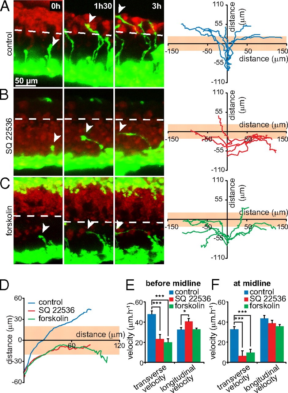 Disruption of cAMP signaling prevents midline crossing of commissural axons in vivo. (A) Alexa 488 dextran-filled commissural axons imaged in the intact spinal cord of control embryos grow to the ventral midline (dashed line at the Alexa 568 border), cross it, and turn rostrally or caudally along the contralateral ventral fascicle (Left). Trajectories of control growth cones (Right). Orange horizontal bar represents the floor plate. (B) Commissural axons in a SQ 22536-treated spinal cord grow to the ventral midline but fail to cross it. (C) Treating the spinal cord with forskolin also prevents axons from crossing the midline. (A�C) n > 25 growth cones. All trajectories are shown in Fig. S7B. (D) Trajectories of individual axons were aligned to obtain an average trajectory for each experimental condition, and rostrally and caudally turning trajectories were superimposed. Averaged trajectories demonstrate a failure of midline crossing when spinal cords are treated with SQ22536 or forskolin. More than 25 trajectories were scored for each condition. (E) To distinguish effects on axon directionality and growth, we quantified the transverse velocity (toward the midline) and the longitudinal velocity (parallel to the midline) of axons from spinal cords exposed to control, SQ22536-, or forskolin-containing medium. The transverse velocity was reduced by high or low cAMP concentration before the midline and (F) further suppressed within a 40-μm�wide area around the ventral midline. In contrast, the longitudinal velocity was only slightly affected by modifying the cAMP concentration. (E and F) Error bars, SEM; ***P < 0.001, *P < 0.05, ANOVA