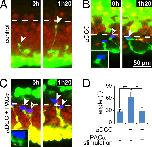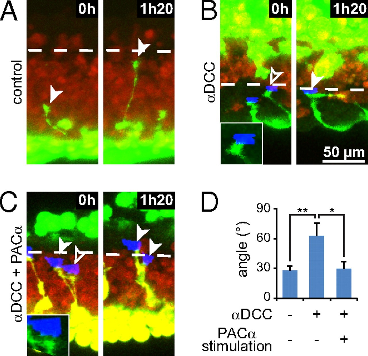 Local and pulsatile optogenetic elevation of cAMP concentration rescues defects of commissural axon pathfinding in vivo. (A) Before crossing the ventral midline, Alexa 488 dextran-filled commissural axons grow perpendicular to the midline (dashed line at the Alexa 568 border). Arrowheads identify growth cones. (B) Application of a blocking antibody against DCC prevents axons from growing perpendicular to the midline. Blue light illumination of growth cones that do not express PACα (blue areas; uninjected side of the animal, not labeled with Alexa 568) does not rescue this defect. (Inset) Outlined arrowhead indicates enlarged growth cone. (C) Local and pulsatile illumination (blue areas; 3 min three times per hour) of PACα-expressing growth cones (PACα and Alexa 568-coinjected side of the animal) maintain the orientation of axon growth toward the midline. (D) Mean angle of axon trajectory deviation from the perpendicular to the midline. Twelve or more trajectories were scored for each condition. Error bars, SEM; **P < 0.01, *P < 0.05, ANOVA.