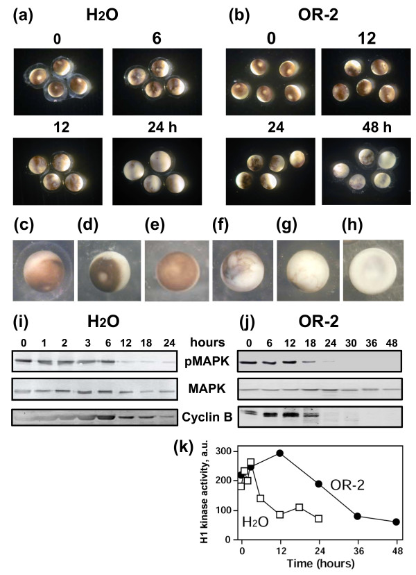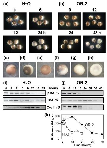 Figure 1. Spontaneous meiotic exit in unfertilized Xenopus eggs. Changes in the morphology of water-deposited (a) and OR-2 buffer-deposited (b) eggs, major morphological types of the unfertilized eggs (c-h), MAPK dephosphorylation and cyclin B2 degradation (i, j), and H1 kinase activity of Cdk1 in water-deposited and buffer-deposited eggs (k) are presented. Time after egg ovulation (hours) is indicated.