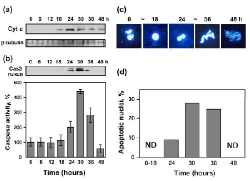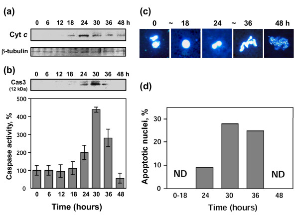 Figure 2. Features of classical apoptosis in unfertilized Xenopus eggs. Freshly squeezed eggs obtained after hCG injection were dejellied and placed into OR-2 buffer over the indicated times. Cytochrome c release (a), caspase 3 activation (b), apoptotic nuclear morphology (c), and quantification of morphology scores (d) are shown. Immunoblotting with anti-β tubulin (lower panel in (a)) represents the loading control. The upper panel in (b) shows blotting of egg extracts with anti-caspase 3 antibody, whereas the lower panel presents data of the fluorescent caspase 3 assay, carried out as described in Methods. Bars in panel (b) indicate SD of five to eight measurements using eggs obtained from three different female frogs. About one hundred nuclei were observed in (c) and (d).