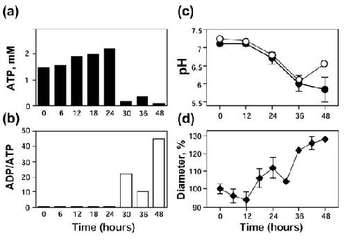 Figure 3. Cell death events in unfertilized Xenopus eggs. Intracellular ATP content (a), ADP/ATP ratio (b), intracellular pH (c), and egg diameter (d) were monitored over 48 hours after ovulation. Intracellular pH in panel (c) was measured using spectrometric and fluorescent assays (closed and open circles, respectively). Bars in panel (c) represent the range of pH readings taken by two persons in double-blind trials and data in panel (d) are means ± SD obtained by measurement of five eggs.