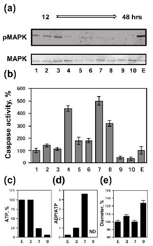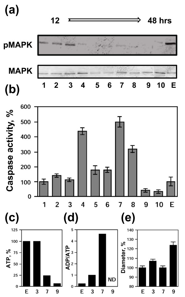 Figure 4. Single-cell analysis of unfertilized Xenopus eggs. MAPK phosphorylation state (a) and caspase 3 activity (b) were determined in the single unfertilized eggs #1-10 taken at different times (12 - 48 hours) after their deposition into OR-2 buffer. Eggs #1-3 were collected within 12 hours of ovulation, eggs #4-8 - within 18-36 hours, and eggs #9-10 - at 48 hours after ovulation. The control egg E was withdrawn immediately after its deposition. Relative intracellular ATP content (c), ADP/ATP ratio (d), and egg diameter (e) were determined for the eggs #3, 4, 9, and E. Bars in (b) and (e) represent the range of duplicate measurements. The total number of eggs taken for the single-cell analysis was 39, among them, 10 eggs were collected within 12 hours of ovulation, 22 eggs - within 18-36 hours, and 7 eggs - at 48 hours after ovulation.