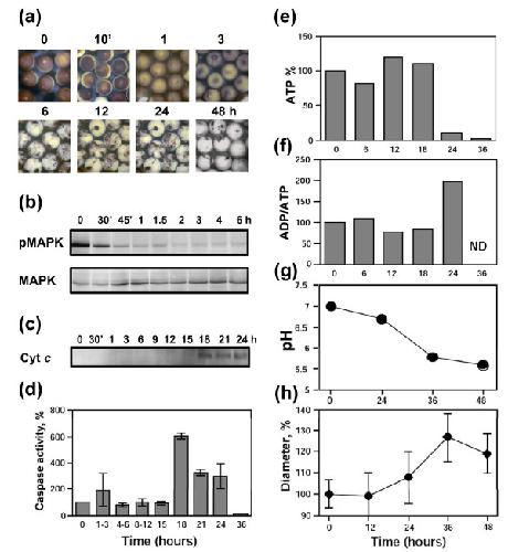 Figure 5. Apoptotic degradation of ionophore-treated Xenopus eggs. Freshly squeezed dejellied eggs were placed into OR-2 buffer, treated with 1 μM calcium ionophore A23187 for 5 min and monitored over indicated times. Egg morphology (a), MAPK activation state (b), cytochrome c release (c), caspase 3 activity (d), intracellular ATP content (e), ADP/ATP ratio (f), intracellular pH (g), and egg diameter (h) have been monitored. In panel (d), the data of three to six measurements in two independent experiments are shown. Bars in panel (h) represent SD of the mean obtained by measurement of three to five eggs.