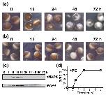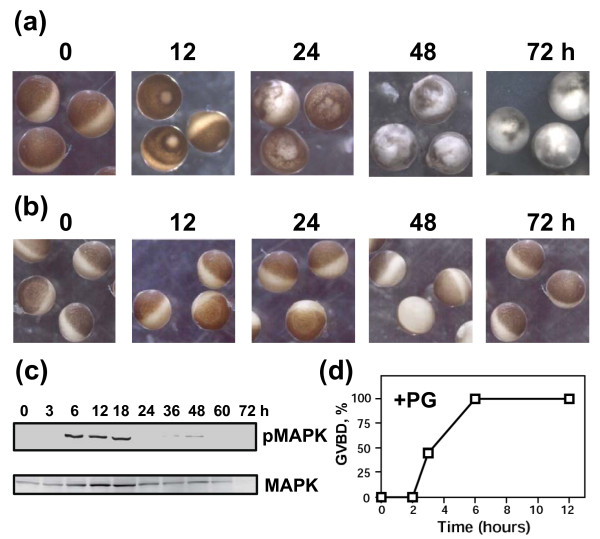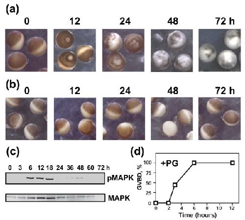 Figure 6. Stability of progesterone-treated and intact Xenopus oocytes. Defollliculated OR-2 buffer-deposited oocytes were treated with 10 μM progesterone or left untreated and monitored over 72 hours. Morphology of the progesterone-treated (a) and -untreated (b) oocytes, MAPK phosphorylation state (c), and time course of GVBD (d) after progesterone addition.