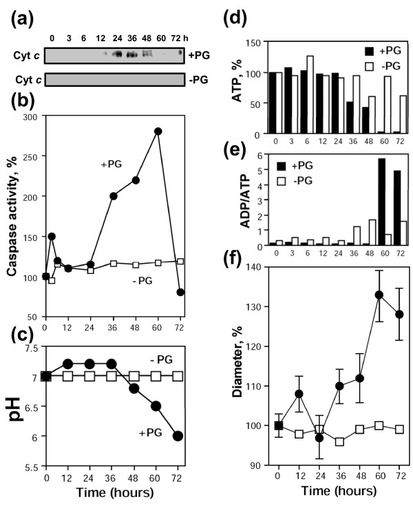 Figure 7. Apoptotic degradation of progesterone-treated Xenopus oocytes. Cytochrome c release (a), caspase 3 activation (b), intracellular pH (c), intracellular ATP content (d), ADP/ATP ratio (e), and egg diameter (f). Bars in panel (f) indicate SD of the mean obtained by measurement of five eggs.