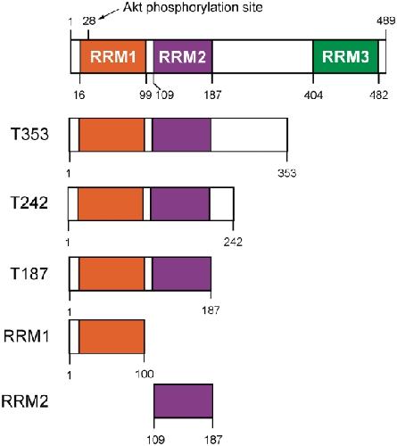 Figure 1. Schematic representation of the protein constructs used in this study and an indication of domain boundaries. The position of the RRMs are shown shaded. Residue Ser28 represents the proposed Akt phosporylation site in RRM1.
