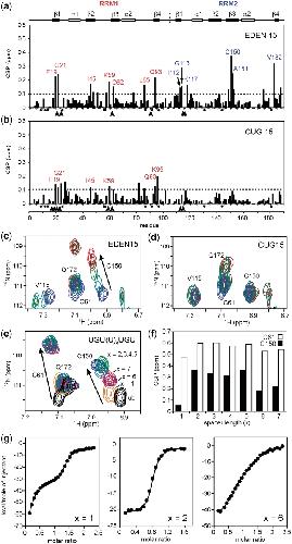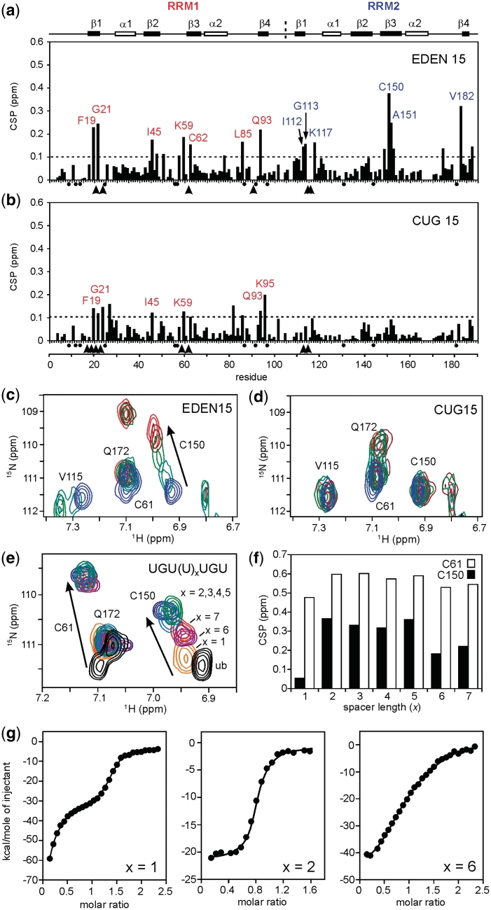 Figure 7. NMR CSP plots for the binding of EDEN15 (a) and CUG15 (b) to T187. In each case an arbitrary cut-off of 0.1 ppm is shown by the dotted line with residues showing CSPs > 0.1 ppm individually labelled. In addition, residues which broaden and disappear during the titration are marked with an arrow head. No assignments were obtained for proline residues and these are marked with a black dot. Along the top of the figure the relative position of the protein secondary structure is indicated with the domain boundary between RRM1 and RRM2 shown at residue 110. Representative portions of the 1H/15N TROSY spectra from the two titrations are shown in (c) and (d). In particular, residue C150 in RRM2 is perturbed by the binding of EDEN15 (c), but not by CUG15 (d). Five TROSY spectra are overlayed in each case representing protein:RNA ratios in the range 1:0–1:1. (e) Similar overlayed portions of the 1H/15N TROSY spectrum of T187 showing the limiting CSPs for Cys61 (RRM1) and Cys150 (RRM2) at binding saturation with a series of related RNA sequences containing different U spacers UGU(U)xUGU, where x = 1–7. (f) Histogram plot showing the CSP data from (e) for Cys61 and Cys150 with the CSPs for RRM1 reaching a plateau between x = 2–5; longer U spacers (x = 6 and 7), or a very short spacer (x = 1) result in a reduction in binding affinity for RRM2 but little difference in the shift of Cys61 in RRM1. (g) Binding isotherms at 298 K from ITC studies of T187 with UGU(U)xUGU sequences where x = 1, 2 and 6. The shortest sequence (x = 1) shows a biphasic binding behaviour whereas the two other sequences (x = 2 and 4) fit to a 1:1 binding model.