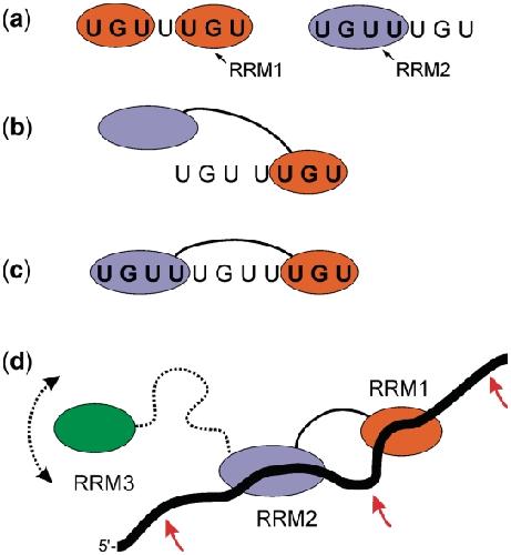 Figure 8. Schematic representation of the binding of RRM1, RRM2 and T187 to RNA substrates. (a) EDEN7 is able to accommodate two RRM1s on adjacent UGU sites, but only a single RRM2 can bind to the same sequence, suggesting specificity for a UGUU binding site. (b) EDEN7 is too short to bind the two RRMs of T187 in tandem, instead we observe an interaction through RRM1 which could be at either of the two UGU sites (one shown). (c) Binding of T187 to both sites of the consensus GRE sequence (EDEN11) with RRM2 bound at the 5′-terminal UGUU site. The spacer sequence of 5 nt between the tandem UGU sites results in high affinity binding. (d) Possible interaction of full-length CELF1 with a GU-rich substrate with RRM1 and RRM2 bound as for the consensus sequence in (c); the long linker between RRM2 and RRM3 permits considerable conformational flexibility in binding a third UGU site up or down stream (position of arrows), or even to the looped-out spacer sequence between the RRM1 and RRM2 binding sites.