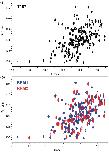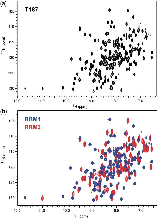Figure 4. 2D 1H/15N-TROSY NMR spectra of T187 (a) and overlayed spectra of RRM1 (red) and RRM2 (blue) in (b) showing that the longer construct is well represented by the sum of the spectra of the individual domains, except for a few perturbations at the domain boundaries. Spectra were collected at 298 K in 25 mM phosphate buffer, 50 mM NaCl, 10% D2O (v/v), pH 7.0 with protein sample concentrations in the range 400–500 µM.