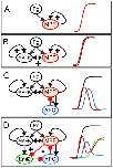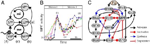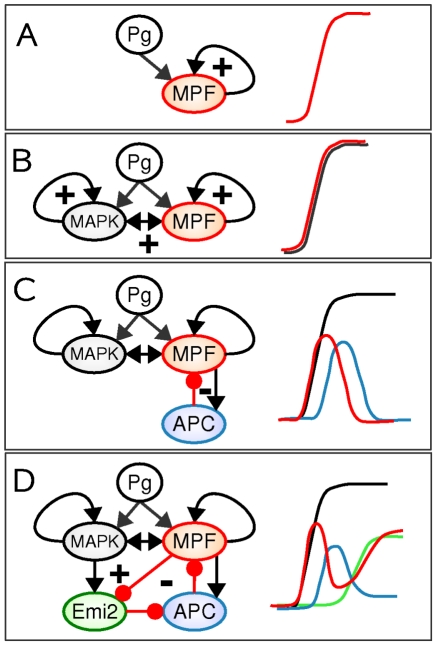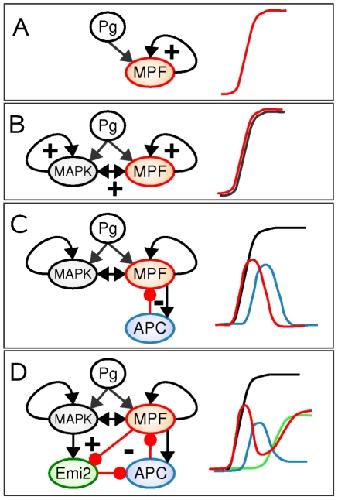 Figure 6. Feedback design principles of oocyte meiotic maturation.(A)The auto-amplification positive-feedback loop switches on MPF activity (Red). (B) Coupled positive-feedback loops ensure a coherent switch of the MPF and MAPK activities (black). (C) The negative-feedback loop linking MPF and APC (blue) triggers a transient decrease of MPF activity that does not impact the high MAPK activities maintained by independent positive-feedback loops. (D) Delayed activation of a positive-feedback loop mediated by Emi2 (green) antagonizes the negative-feedback loop, so as to fully reactivate MPF.